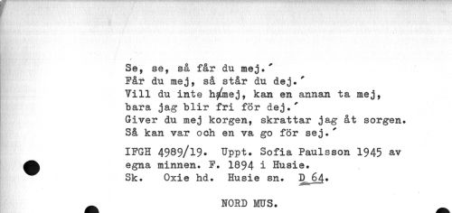 //// Se, se, så får du mej.' //// Får du mej, så står du dej.' //// Vill du inte h^mej, kan en annan ta mej, //// bara jag blir fri för dej.' //// Giver du mej korgen, skrattar jag åt sorgen. Så kan var och en va go för sej.' //// IFGH 4989/19» tfppt. Sofia Paulsson 1945 av egna minnen. F. 1894 i Husie. Sk. Oxie hd. Husie sn. ^64. //// NORD MUS. ////