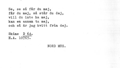 //// Se, se så får du mej, //// får du mej, så står du dej, //// vill du inte ha mej, //// kan en annan ta mej, //// och så är jag kvitt från dej. //// Skåne D 64» H.A. 10769.* //// NORD MUS. ////