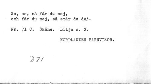 //// Se, se, så får du mej, //// och får du mej, så står du dej. //// Fr. 71 C. Skåne. Lilja s. 2. //// NORDLANDER BARNVISOR. //// 77/ ////