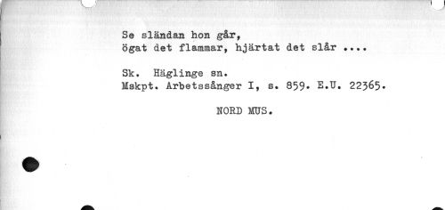//// Se sländan hon går, //// ögat det flammar, hjärtat det slår //// Sk. Häglinge sn. //// Mskpt. Arbetssånger I, s. 859* E.U. 22365» //// NORD MUS. ////