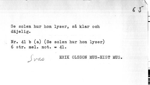//// € L //// Se solen hur hon lyser, så klar och däjelig. //// Nr. 41 (st) (Se solen hur hon lyser) 6 str. mel. not. « 41* //// 1 //// ERIK OLSSON MUS-HIST MUS. //// I //// i 1 //// 1 //// ] ////