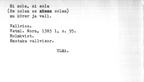 //// Si sola, si sola //// (Se solen se xiMK solen) ! //// nu körer ja vall. //// Vallvisa» //// Vstml. Nora, 1383 19 s. 95» //// Holmkvist. //// Enstaka vallvisor. //// ; //// ULMÅ. //// | //// i j //// - //// i I ////