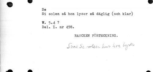 //// Se //// Si solen så hon lyser så daglig (och klar) //// W. 5.4 ? //// Del. I. nr 498. //// RANCKEN FÖRTECKNING. //// Jl/+o Sc c^rtt^ U^ hm, Cw^ ////