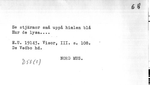 //// 6 9 //// Se stjärnor små uppå himlen blå Hur de lysa...• //// E.U. 19143. Visor, III. s. 108. Ds Vedbo hd. //// HORD MUS. //// 2)5~IO) [ //// ) //// ¦ ////