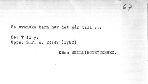 //// 6? //// Se svenska barn hur det går till ... Ses T 11 y. //// Upps. Z.P. s. 23:47 (1782) //// KB:s SKILLINGTRYCKSREG. //// fc i //// r //// • i ////