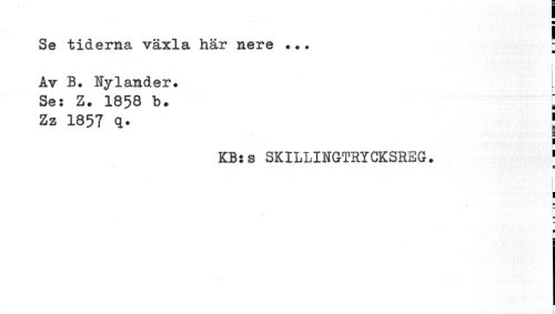 //// ¦ //// Se tiderna växla här nere ?.. F //// i //// Av B. Nyländer. Se: Z. 1858 b. //// Zz 1857 q. j //// KB:s SKILLINGTRYCKSREG. \ //// I //// e f ////