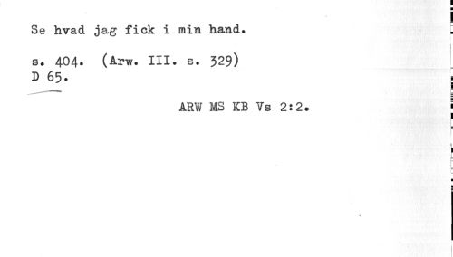 //// ! //// Se hvad jag fick i min hand. ; //// i //// s. 404. (Arw. III. s. 329) //// D 65. , //// ARW MS KB Vs 2:2. ¦ //// 1 //// m //// i ) //// ¦ //// e //// % i ////