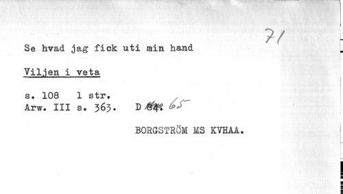 //// Se hvad jag fick uti min hand //// w //// Viljen i veta //// s. 108 1 str. Arw. III s. 363. //// BORGSTRÖM MS KVEAA. //// { //// r- //// I //// | //// P ¦ ////