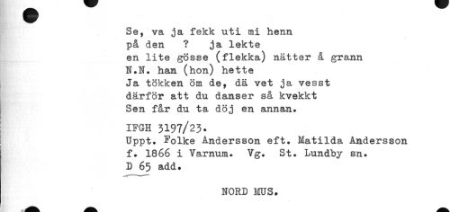 //// v //// Se, va ja fekk uti mi henn //// på den ? ja lekte //// en lite gösse (flekka) nätter å grann //// N.N. han (hon) hette //// Ja tökken öm de, dä vet ja vesst //// därför att du danser så kvekkt //// Sen får du ta döj en annan. //// IFGH 3197/23. //// Uppt. Folke Andersson eft. Matilda Andersson f. 1866 i Varnum. Vg. St. Lundby sn. D 65 add. //// NORD MUS. ////