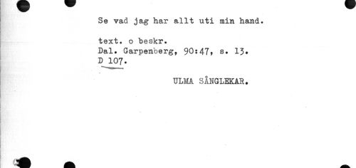 //// Se vad jag har allt uti min hand. text. o beskr. //// Dal. Garpenberg, 90*47> b. 13. //// D 107. //// » //// IJLMå SÅNGLEKAR. ////