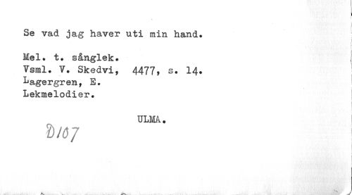//// i I //// I i //// Se vad jag haver uti min hand. ! //// v //// Mel. t. sånglek. //// Vsml. V. Skedvi, 4477, s. 14. //// lagergren, E. Lekmelodier. //// I //// ULMA. //// Djöj i //// | //// ! //// liÉ J //// /V. - ////