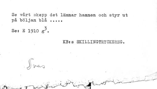 //// T //// Se vårt skepp det lämnar hamnen och styr ut på böljan blå ... //// Ses E 1910 g5. //// KBss SKILLINGTRYCKSREG. //// •» //// . J V^o //// » //// p //// , . ,...w...Vrv4l...^...^... ... ////