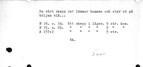 //// Se vårt skepp det lämnar hamnen och styr ut på böljan blå.•• //// B 26. s. 34. Ett skepp i lågor. 9 str. kom. B 35. s. 83. « » tT » 9 11 " Å 237i2 " " " " 9 str. //// RA. //// J Ir^O ////