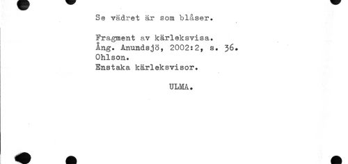 //// Se vädret är som blåser» //// Fragment av kärleksvisa. Ang. Anundsjö, 2002:2, s. 36. Ohlson. //// Enstaka kärleksvisor. //// ULMA. ////