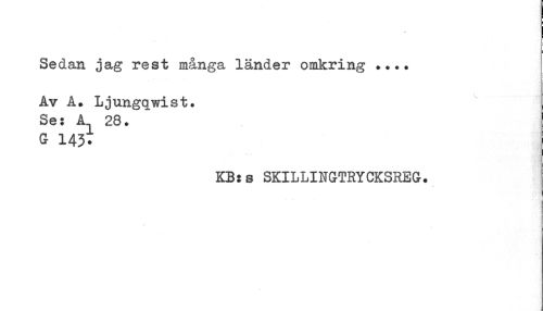 //// » //// I //// Sedan jag rest många länder omkring ... //// Av A. Ljungqwist. Se: A 28. //// G 143- //// KB:s SKILLINGTRYCKSHEG. ////