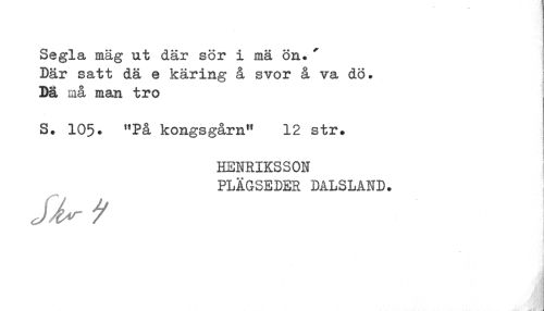 //// Segla mag ut där sör i mä ön.' Där satt dä e käring å svor å va dö. Dä må man tro //// S. 105. "På koagsgårn" 12 str. //// HENRIKSSON PLÄGSEDER DALSLAND. //// Slrt //// ¦ //// m/M ////