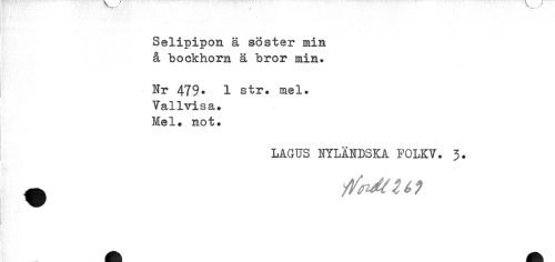 //// Selipipon ä söster mim å bockhorn ä bror min. //// Nr 479• 1 str. mel. //// Vallvisa. //// Mel. not. //// LAGUS NYLANDSKA FOLK V. 3. //// - — ////