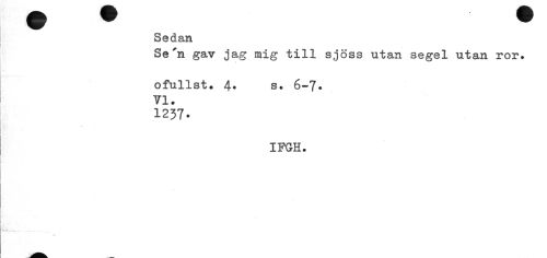 //// Sedan //// Se'n gav jag mig till sjöss utan segel utan ror» //// f //// ofullst. 4' s. 6-7. VI. //// 1237- //// IFGH. //// .. ... ___ ////