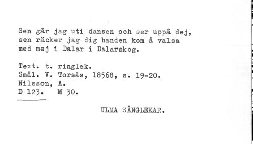 //// Sen går jag uti dansen och ser uppå dej, sen räcker jag dig handen kom å valsa //// med mej i Dalar i Dalarskog. i //// j //// Text. t. ringlek. [ //// Smål. V. Torsås, 18568, s. 19-20. ! Nilsson, A. //// D 123. M 30. t //// ULMA SÅNGLEKAR. j ////