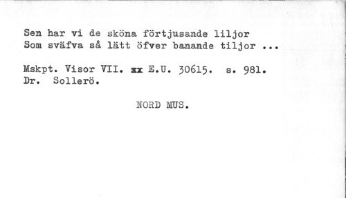 //// Sen har vi de sköna förtjusande liljor Som sväfva så lätt öfver banande tiljor ... //// Mskpt. Visor VII. xx E.U. 30615. s. 981. Dr. Sollerö. //// HORD MUS. ////
