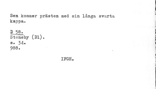 //// Sen kommer prästen med sin långa svarta ! //// kappa. //// D Hl ! //// Steneby (Dl). f //// s. 34. 1 988. //// IFGH. [ ////