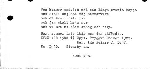 //// Sen kommer prästen med sin långa svarta kappa //// och skall dej och mej sammanviga //// och du skall heta far //// och jag skall heta mor //// och vi ska ha "både dräng och piga. //// Ber. kommer inte ihåg hur den utfördes. IFGH 188 (988 ?) Upp t. Tryggve Heimer 1927» //// Ber. Ida Heimer f. 1857» Ds. D 58. Steneby sn. //// HORD I«US. ////