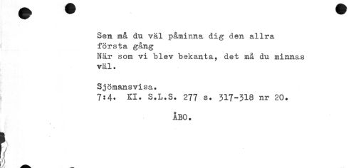 //// Sen må du väl påminna dig den allra första gång //// När som vi blev bekanta, det må du minnas väl. //// Sjömansvisa. //// 7:4* Kl. S.L.S. 277 s. 317-318 nr 20. //// ÅBO. //// i //// i - ////
