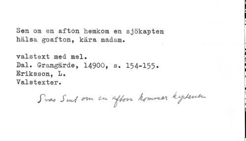 //// Sen om en afton hemkom en sjökapten hälsa goafton, kära madam. //// i ¦ //// valstext med mel. j //// Dal. Grangärde, 14900, s. 154-155* j //// Eriksson, L. Valstexter. //// i ////