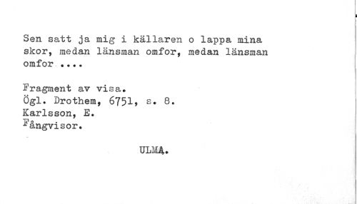 //// I //// f //// Sen satt ja mig i källaren o lappa mina skor, medan länsman omfor, medan länsman omfor ... //// Fragment av visa. //// ögl. Drothem, 6751, s. 8. //// Karlsson, E. //// ^ångvisor. //// i ////