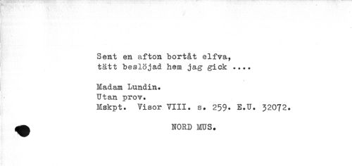 //// Sent en afton bortåt elfva, tätt beslöjad hem jag gick //// Madam Lundin. Utan prov. //// Mskpt. Visor VIII. s. 259. E.U. 32072. ^ NORD MUS» ////