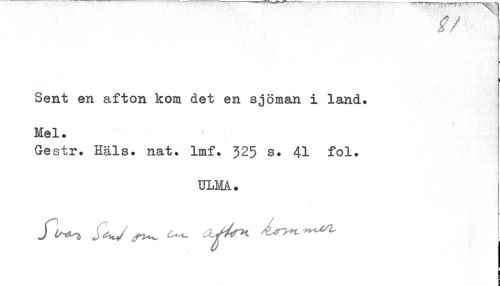 //// i-/ //// I //// Sent en afton kom det en sjöman i land. Mel. //// Gestr. Häls. nat. lmf. 325 s. 41 fol. //// ULMiU ////