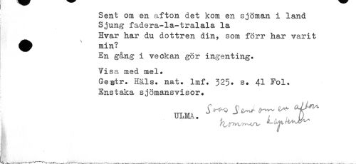 //// Sent om en afton det kom en sjöman i land Sjung fadera-la-tralala la //// Hvar har du dottren din, som förr har varit ^^ min? //// En gång i veckan gör ingenting. //// Visa med mel. //// Gestr. Hals. nat. Imf. 325» s# 41 Pol. Enstaka sjömansvisor. //// ULMÅ. , /) ////