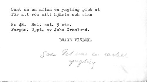 //// Sent om en afton en yngling gick ut för att roa sitt hjärta och sinn //// Hr 48. Mel. not. 3 str. Pargas. Uppt. av John Granlund. //// BRAGE VISBOK. //// Vt1U> stUJk* > £e* 4M, i / //// TT^y //// ___„-¦ ////