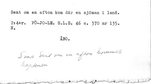 //// Sent om en afton kom där en sjöman i land. //// 2:4+r. FÖ-JO-LE. S.L.S. 46 s. 370 nr 135. H. //// ÅBO. ////