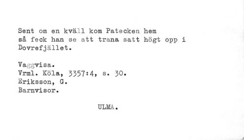 //// Sent om en kväll kom Patecken hem så feck han se att trana satt högt opp i Dovrefj ot Het. //// Vaggvisa. //// Vrml. Köla, 335714, s. 30. //// Eriksson, G. //// Barnvisor. //// ulmä.. //// A ////