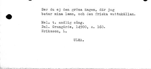 //// Ser du ej den gröna ängen, där jag ^^ betar mina lamm, och den friska vattukällan. //// Mel» t* andlig sång. //// Dal. Grangärde, 14900» s* 160. //// Eriksson, L. //// ULM. ////