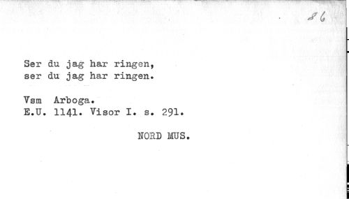 //// st //// ¦ //// Ser du jag har ringen, ser du jag har ringen. //// Vsm Arboga. //// E.U. 1141. Visor I. s. 291» //// NORD MOS. ////