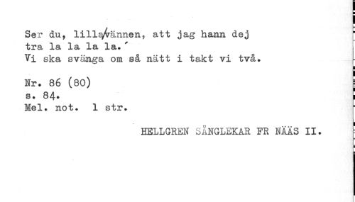 //// Ser du, lills^ännen, att jag hann dej tra la la la la. ' //// Vi ska svänga om så nätt i takt vi två. //// i //// Hr. 86 (80) S //// s. 84. E //// Mel. not. 1 str. //// HELLGREN SÅNGLEKAR PR NÄÄS II. I //// i i ////