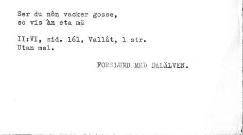 //// I //// Ser du non vacker gosse, so vis an eta mä //// II:VT, sid. 161, Vallåt, 1 str. Utan mel. //// FORSLUND MED DALALVEN. //// ___ ... ... .. ~ . ¦ J ////