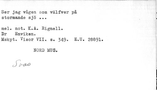 //// Ser jag vågen som välfver på //// stormande sjö ... . //// mel. not. K.Å. Rignell. Dr Enviken. //// Mskpt. Visor VII. s. 349. E.U. 28891. //// NORD MUS. //// <J Is-frö ////