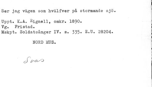 //// i //// Ser jag vägen som hvälfver på stormande sjö» Uppt. K.A. Hignell, omkr. 1890. //// Vg. Fristad» I //// Mskpt. Soldatsånger IV. s. 335* E.U. 28204* jj //// HORD MUS. //// i //// c ////
