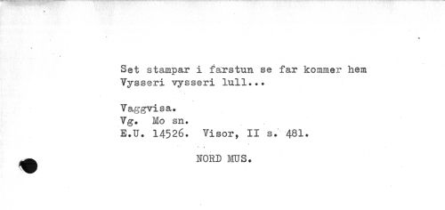 //// « //// Set stampar i farstun se far kommer hem Vysseri vysseri lull... //// Vaggvisa. Vg. Mo sn. //// E.U. 14526. Visor, II s. 481. //// 9 //// • t //// ^ HORD MUS. ////