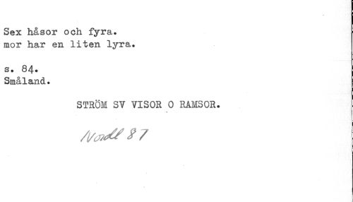 //// Sex håsor och fyra. mor har en liten lyra. //// s. 84* Småland. //// STRÖM SV VISOR 0 RAMSOR. //// < ////