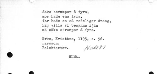 //// Saks strumpor å fyra, //// mor hade ena lyra, //// far hade en så redeliger dräng, //// häj villa vi begynna ijän //// mä säks strumpor å fyra. //// Nrke, Kvistbro, 1195> s. 56. //// Larsson. Polsktexter. //// • ULMA.. ////