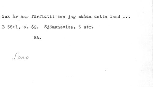 //// Sex år har förflutit sen jag skåda detta land ... B 58:1, 62. Sjömansvisa. 5 str. //// RÅ. ////
