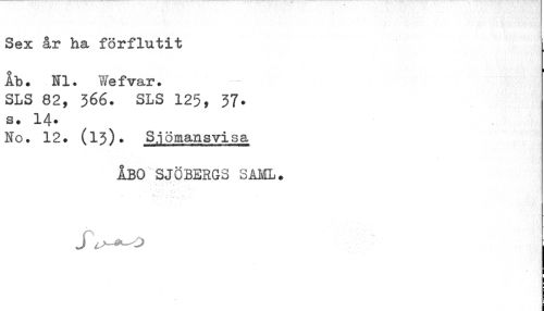 //// Sex år ha förflutit //// i //// ib. Hl. Wefvar. //// SLS 82, 366. SLS 125, 37' //// s. 14. //// No. 12. (l3)« S.jömansvisa //// ÅBO SJÖBERGS SAML. ////