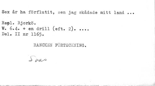 //// Sex år ha förflutit, sen jag skådade mitt land . ?. //// .. //// Repl. Björkö. //// W. 6.4- + en drill (eft. 2). ... Del. II nr II65. //// RANCKEN FÖRTECKNING. //// ^ ////