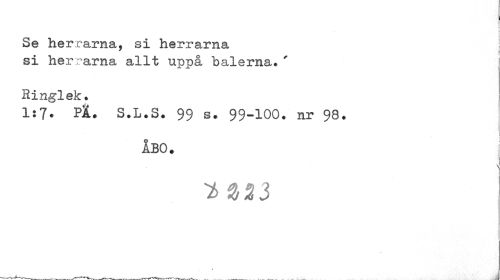 //// i //// t //// Se herrarna, si herrarna | //// si herrarna allt uppå balerna.' //// Hinglek. //// 1:7. P2L S.L.S. 99 s. 99-100. nr 98» //// ÅBO. //// v //// .,.___—... _ __ ___ . S-- --- - — —- ////