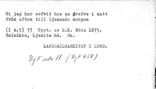 //// Si jag har sofvit hos en grefve i natt från afton till ljusande morgon //// (I A.5) 77 Uppt. av E.K. Böös 1875- //// Balkåkra, Ljunits hd. Sk. //// LMDSMÅLSABKIVET I LUND. //// i» ruH // {»}¦F ////