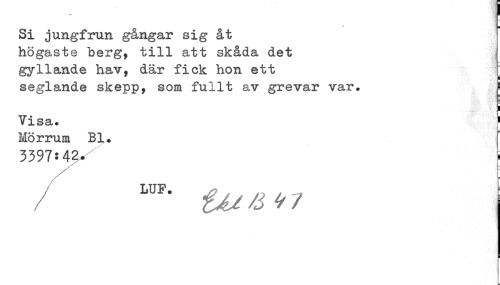 //// Si jungfrun gångar sig åt //// högaste berg, till att skåda det I //// gy 11 ande hav, där fick hon ett r //// seglande skepp, som fullt av grevar var. i //// Yisa. 1 Mörrum Bl. //// 3397:42- \ //// & — //// / MF- fJJ/i<<7 //// i ////